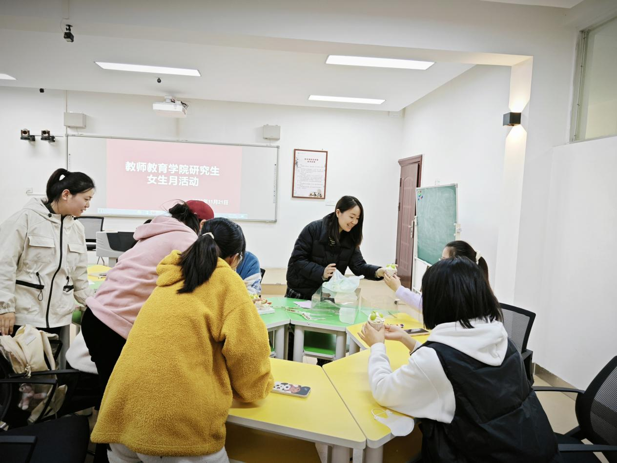 为了全面丰富研究生的课余生活,营造浓厚的研究生校园文化氛围,展现当代研究生朝气蓬勃、青春活泼的精神风貌。2023年11月21日下午,教师教育学院研究生女生月活动在教七楼402室顺利举行。本次活动由学院研究生秘书常燕燕老师主持,2023级小学教育专业全体研究生参加。