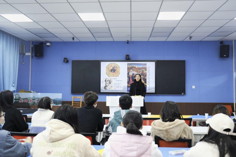 章彩云分别从文化意识的概念和内涵、文化意识的意义和价值、英语教学中文化意识的培养路径、中西文化的差异、让世界了解中国五个方面为实验班全体学生带来一场生动精彩的专题报告。首先,章彩云以英语课标大纲的基本理念为切入点,讲述了文化意识的概念和内涵,深刻解读了文化意识的意义,强调了文化意识对于英语教学以及中华传统文化的重要价值。同时,她引用儒、道、佛的文化知识,教学生采用以物质、精神、制度以及民俗为内容的中华文化四分法进行文化理解。随后,章彩云将美术图画艺术与文化相结合,借助历史故事、文字建筑等形式,阐述了中华优秀传统文化在世界中举足轻重的地位,鼓励同学们尊重文化多样性,增强文化自信,树立文化自觉。最后,章彩云回归主题,强调了外语课程对于文化意识形成的独特性,向同学们提出了通过领悟多元文化,提高文化素养,养成良好的文化意识的建议。