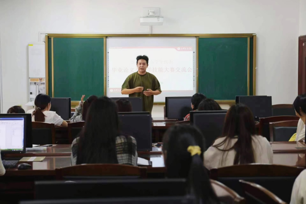会上,四位20级优秀学生代表结合自身经验依次分享。首先,邹文静结合参赛教学案例,对课件制作、课堂教学细节等方面进行了细致的讲解。李子昂则结合参赛经历,着重强调了比赛心态问题,鼓励同学们自信从容面对每一次挑战。接着,王梦丹交流了论文写作中需要规避的若干问题,如选题要从小处切入,且难度适中。刘亚雯则介绍了论文写作的具体内容,要提前与老师沟通好调查问卷题目与论文框架。最后,在交流环节,与会同学积极参与互动,现场氛围热烈,学长学姐做出耐心解答,并祝愿同学们能顺利完成论文写作,提高自身教学技能与实践应用能力。