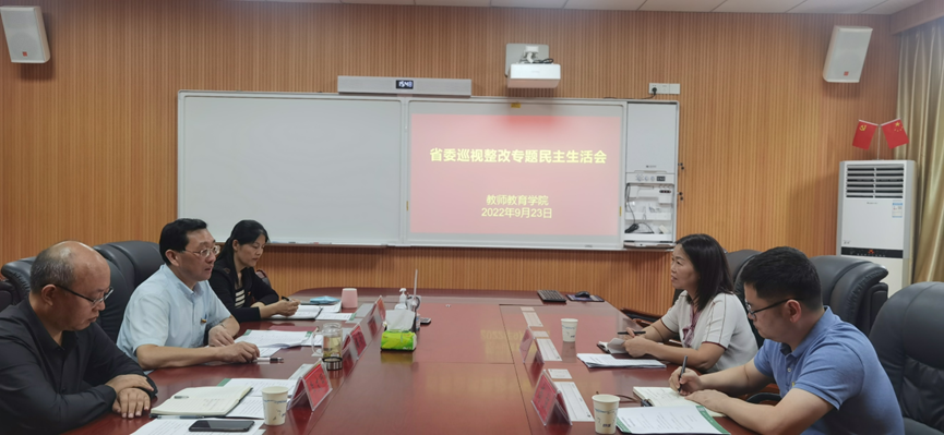 9月23日下午,教师教育学院在教七楼301会议室召开省委巡视整改专题民主生活会,会议由学院党委书记潘登主持,学院党委班子成员参加会议。学校第六指导组组长刘党英、成员尚弦莅临指导专题民主生活会。