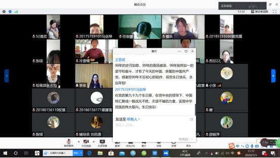 为深入学习贯彻习近平新时代中国特色社会主义思想和党的十九大精神,推动“不忘初心、牢记使命”主题教育走深走实,教师教育学院学生党支部于7月1日在腾讯会议组织开展了“牢记初心使命,争当出彩先锋”主题党日活动。学生党支部书记李依,团委老师刘莅原以及全体学生党员参加会议,会议由仇庭慧主持。
