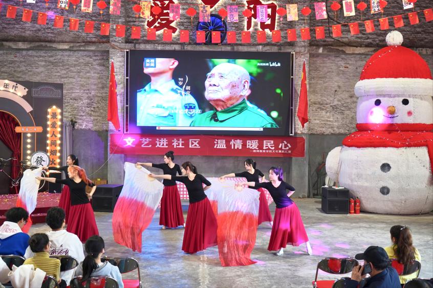 近日,教师教育学院青年学子在分团委书记姚雨承、专业课教师姜璠、吴莉三位老师的带领下,走进信阳市十里河社区,成功举办“文艺进社区,温情暖民心”文化汇演活动。学院师生代表与社区居民欢聚一堂,以多元艺术为载体,将红色文化与活力歌舞送到群众家门口,用青春力量传递温暖,彰显新时代青年的责任与担当。