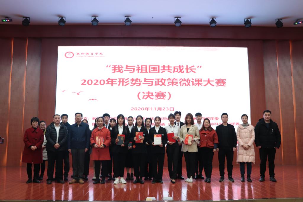 11月23日晚,由教师教育学院思想政治教育与就业指导教研室、教师教育学院团委主办,国际教育学院、教育科学学院、历史文化学院、生命科学学院联合举办的“我与祖国共成长”2020年形势与政策微课大赛的决赛在逸夫楼报告厅圆满落幕。校学工部副部长陈铭,校团委副书记朱国朋,马克思主义学院党委副书记何晓坚,历史文化学院党委副书记刘喜元,教师教育学院党委副书记潘登,教师教育学院科研与研究生秘书李文田,学工部思想政治教育科科长李明,校团委组织部长雷玲,校团委宣传部部长张锐及各学院团委书记出席此次活动。