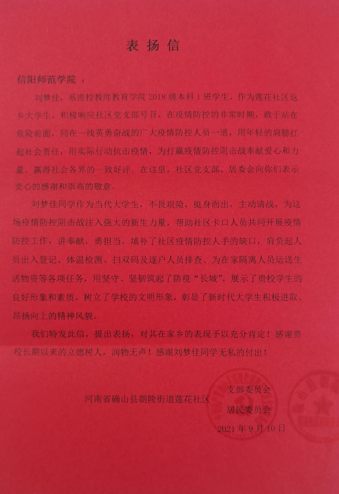 2021年,疫情防控狙击战再次打响。在严峻复杂的防控形势下,教师教育学院学子挺身而出,陆续涌现了一批优秀的疫情防控志愿者。近日,教师教育学院收到来自河南省确山县朗陵街道莲花社区居委会的抗疫表扬信,对我院2018级本科一班刘梦佳同学进行表扬。
