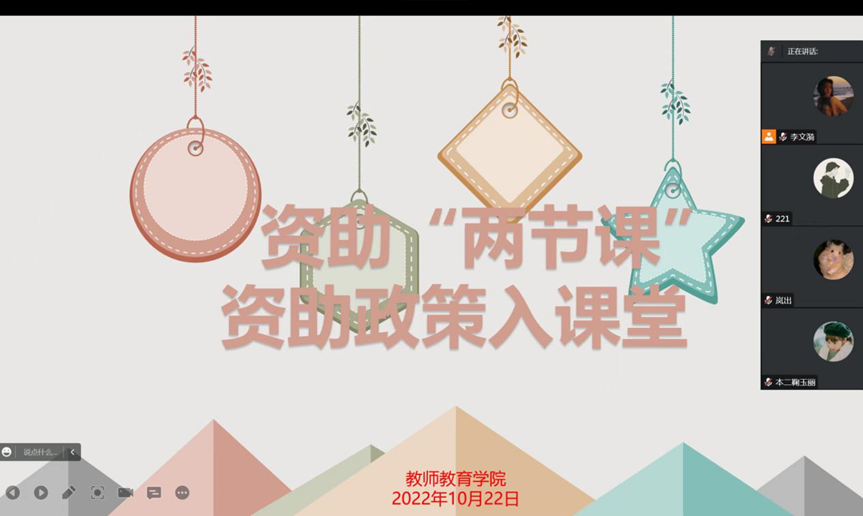 为扎实做好我院资助政策宣讲工作,提升资助育人实效,10月22日下午,教师教育学院在腾讯会议召开“资助两节课”资助政策入课堂宣讲会,2022级全体新生及国奖国励获得者参与本次宣讲会,团委老师李杨担任主讲人。