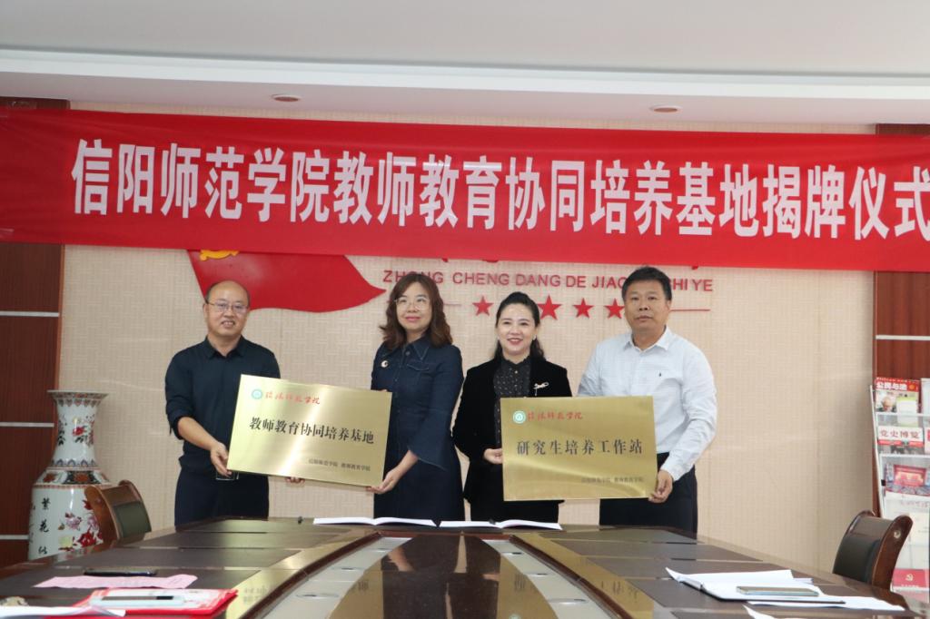 9月18日,教师教育学院与信阳市第九小学在信阳市第九小学会议室举行教师教育协同培养基地暨研究生培养工作站签约及揭牌仪式。教师教育学院副院长付永昌、信阳市第九小学校长周雁翎、副校长杨镝等出席仪式。仪式由付永昌主持。