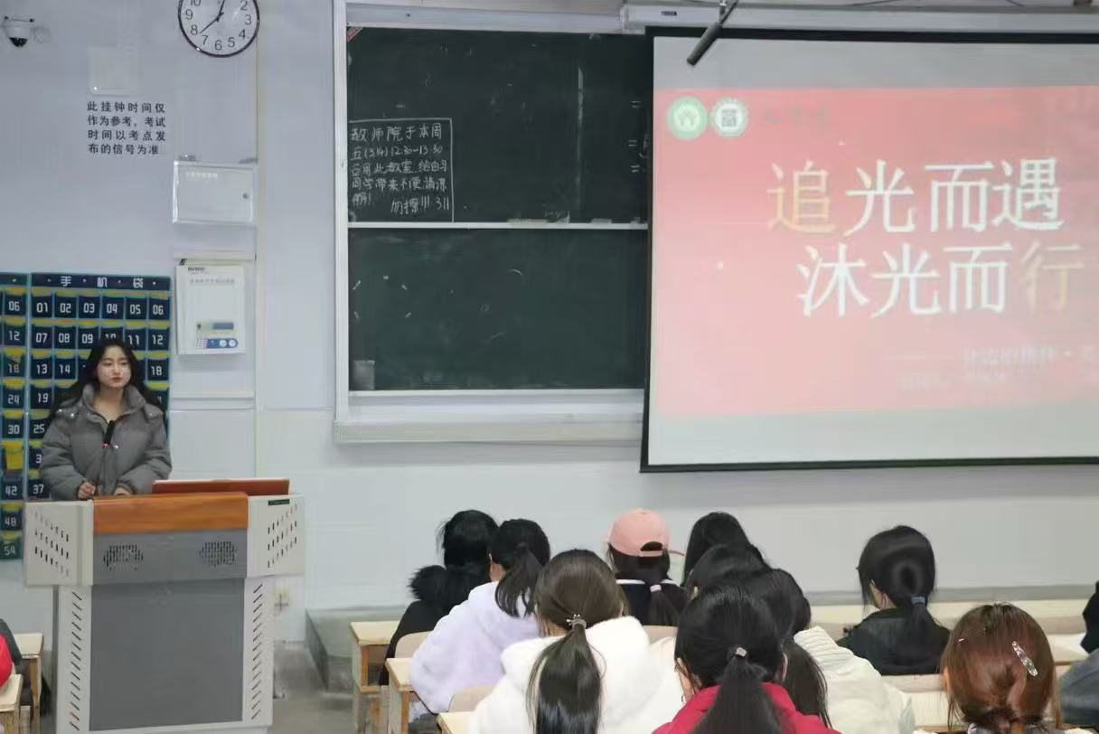 教师教育学院刘馨怡主持本次宣讲活动。文学院尹雨欣、教育科学学院孙林曦、法学与社会学学院刘佳鑫依次向同学们讲述了她们的青春故事。尹雨欣围绕“追光而遇,沐光而行”的故事,分别从三个角度“坚守初心、精耕细耘、学思悟行”阐述自己的成长历程,鼓励同学们在学习上勇攀高峰,在生活中全面发展。孙林曦以“向下扎根,向上生长”为主题,讲述了她的成长“竹”迹,她以“不争一时,安心沉淀,静心蛰伏”激励自己一路前行,她躬身践行,用热爱诠释青春担当,始终坚信“万物都有自己的节奏,每个人都有自己独特的生长方式”,呼吁同学们要扎根基层实践,自信自强,勇于担当。刘佳鑫以“且以青春赴山海,青舟无惧万重山”为题,分别从坚定信念、扎根专业、青春奋斗、志愿服务四个方面分享了自己的校园生活和未来目标,她始终怀揣梦想与信念,投身志愿服务与法律宣讲活动当中,以“维护正义,帮助弱者”为信念,在实现人生价值的道路上砥砺前行,并倡导同学们博学慎思,潜心求学。