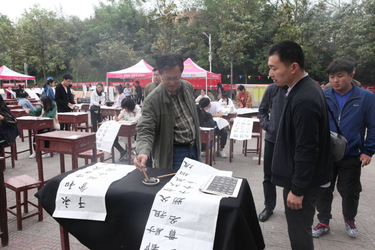 翰墨飘香入兰亭,书法染纸传千古。4月20日,由美术与设计学院主办、大学生书法爱好者协会、景明网、教师教育学院、文学院承办的第一届“兰亭杯”书法大赛在八餐小广场顺利举行。美术与设计学院党委书记刘根货、栗跃崇书法老师、教师教育学院张峰老师、文学院团委老师郑波亲临比赛现场并进行观摩指导。