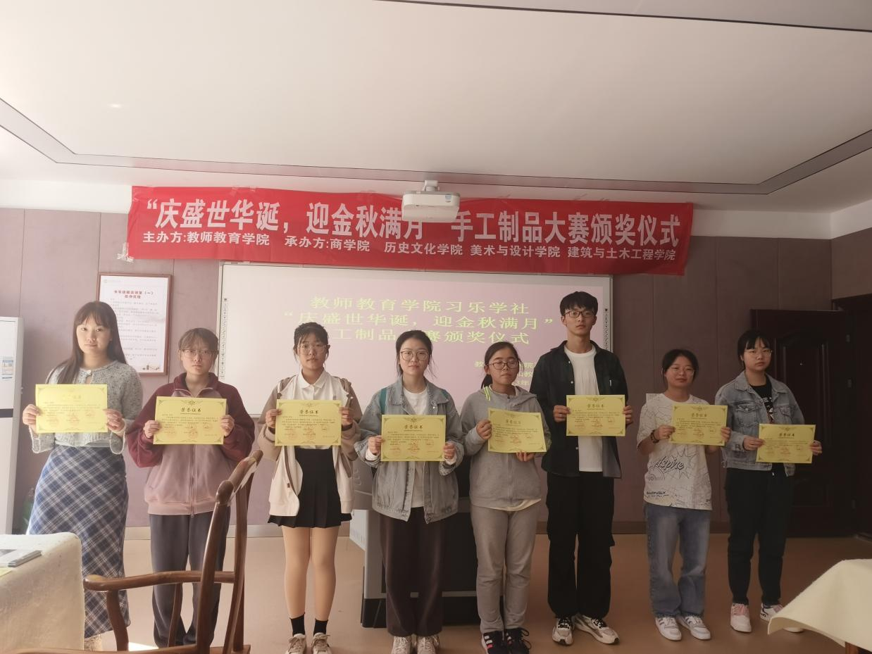 10月24日,由教师教育学院行知教育工作室、习乐学社主办,E01经济学社、建筑爱好者协会、大学生书法爱好者协会、声音文学社共同承办的“庆盛世华诞,迎金秋满月”手工制作大赛颁奖仪式在教七楼201教室顺利举行。此次比赛采取线下征集作品的形式,全校150余人参与。我院特邀王召召老师担任此次大赛评委。