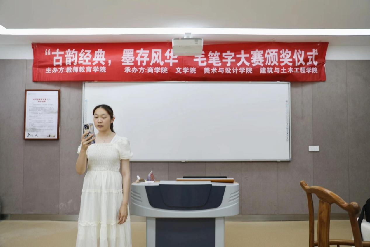 5月9日,由教师教育学院行知教育工作室,习乐学社主办的“古韵诗词,墨存风华”毛笔字书写大赛颁奖仪式在教七楼201教室顺利举行,习乐学社工作人员及本次大赛获奖者共同参加此次颁奖仪式。